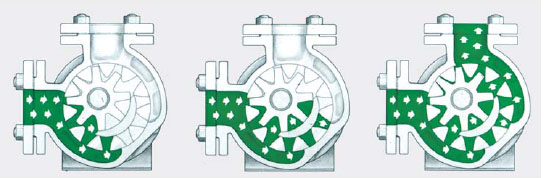 具有內(nèi)齒的驅(qū)動(dòng)從齒輪(轉(zhuǎn)子)帶動(dòng)內(nèi)轉(zhuǎn)子在全封閉的泵體內(nèi)做同方向轉(zhuǎn)動(dòng),泵體和前蓋的月牙使吸入口和排出口隔開,轉(zhuǎn)動(dòng)時(shí)在吸入口形成負(fù)壓,液體被吸入,轉(zhuǎn)子將液體帶到排出口,受壓排出泵體,完成了液體的輸送。